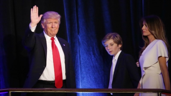 Donald Trump arrives to speak at his election night rally with his son Barron and wife Melania.