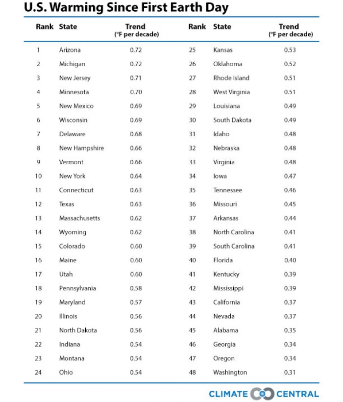 In commemoration of Earth Day, 2013, Climate Central has created an interactive graphic that shows a state-by-state analysis of temperature trends since the first Earth Day took place in 1970. That occasion marked a significant change in America’s environmental consciousness, and led to the creation of, among other things, the Environmental Protection Agency and passage of the Clean Air and Clean Water Acts.