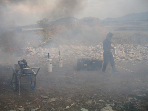 A field worker and the equipment used to measure emissions from burning trash near Mexico City as seen through a shroud of smoke.