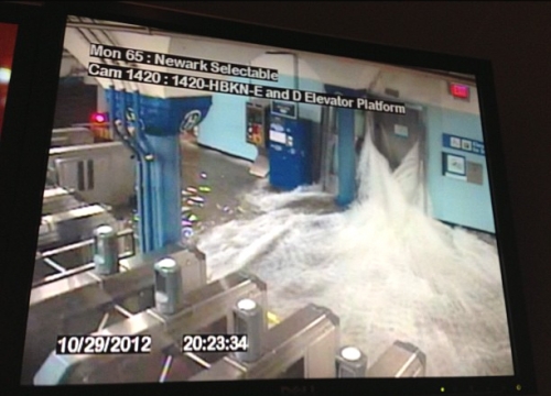Rising sea levels can combine with extreme weather events to flood coastal infrastructure, as occurred during Hurricane Sandy in 2012 at the Hoboken, N.J., transit station.
