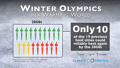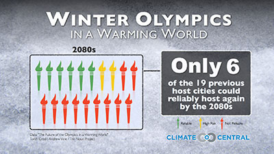 On Friday, the Olympic torch will be lit in Sochi and the Winter Olympics will officially commence. We thought we’d introduce you to the climate of the city that’s playing host to 2,500 Olympians as well as illustrate the threat climate change poses to Sochi and the 18 other past Winter Olympic venues.