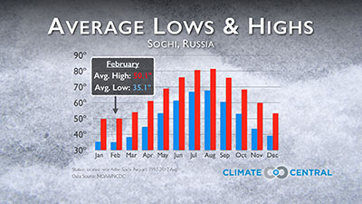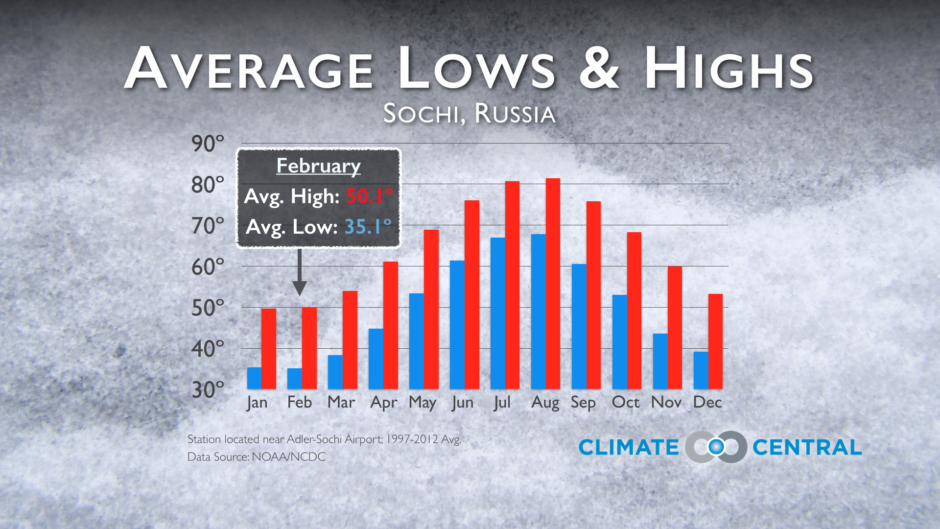Sochi holds the distinction of being the first city with a subtropical climate to host the Winter Games. Its yearly climatology shares more in common with Summer Olympics host Atlanta than previous winter hosts such as Torino, Italy, or Lake Placid, N.Y. Sochi’s average high temperature during February is 50.1°F. The average low temperature doesn’t even crack freezing in February, bottoming out at 35.1°F.