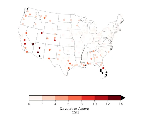 5 out of the top 10 cities with the strongest climate signal were in Florida (Miami, West Palm Beach, Fort Myers, Sarasota, Tampa). Additionally, each of these cities had at least 9 days of temperatures with CSI values of 5.